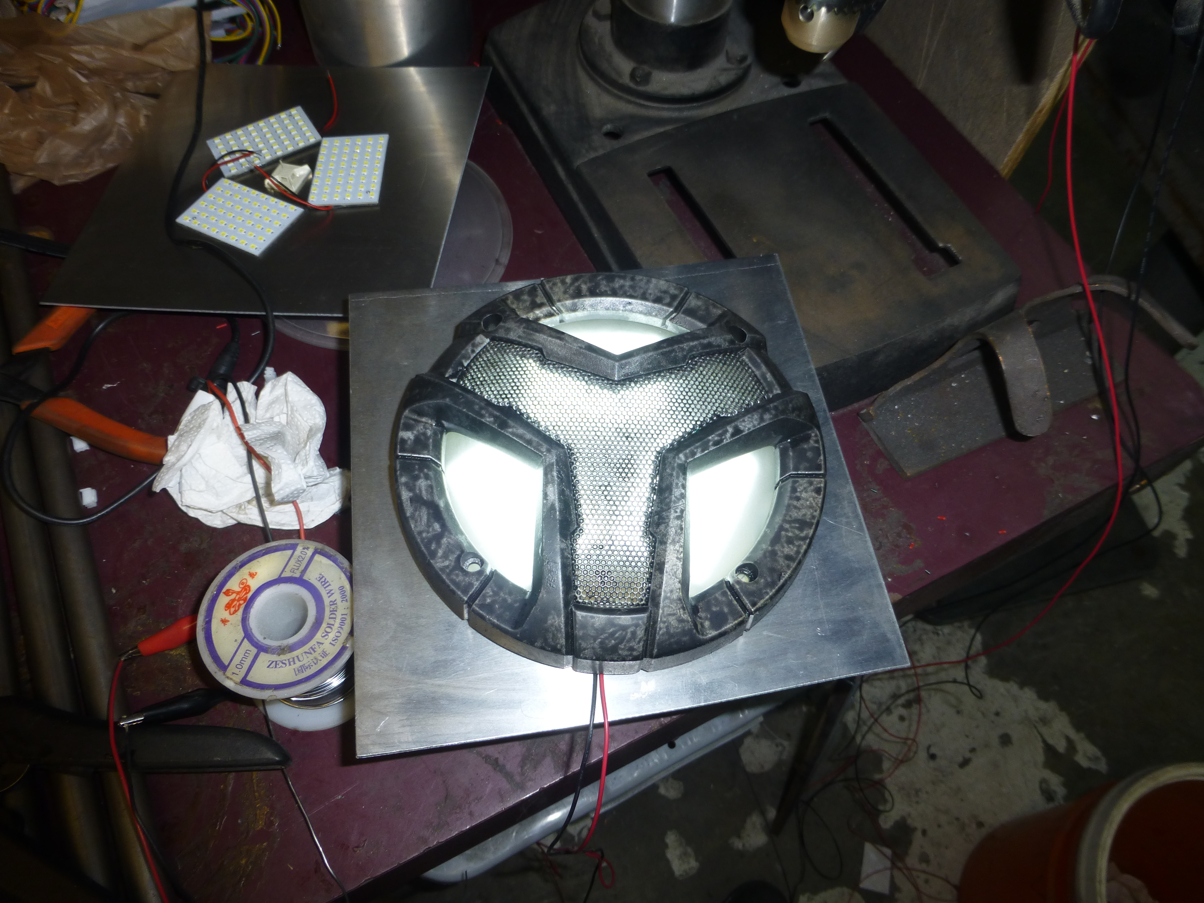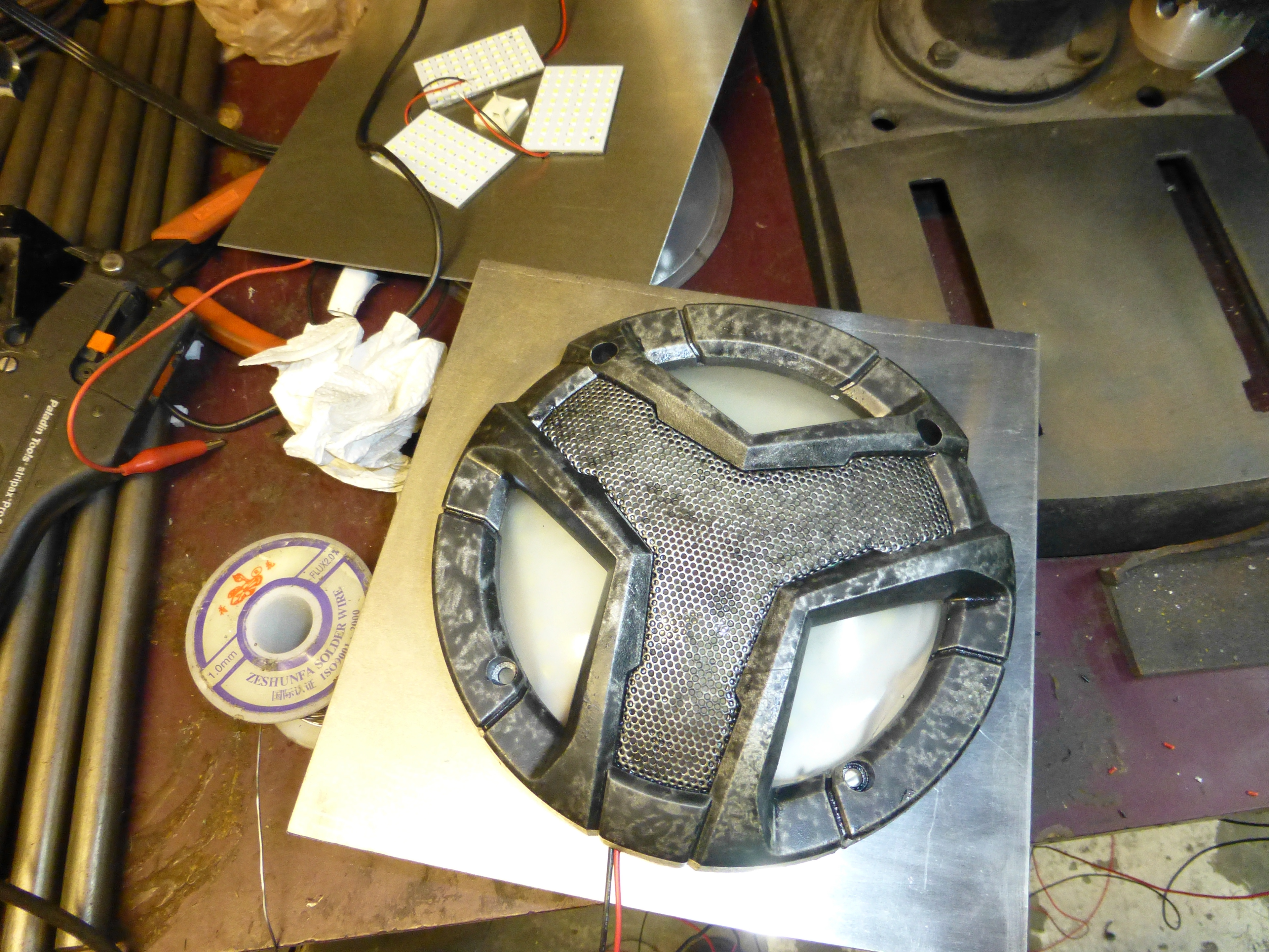 You know all those speaker grills that you never ended up using? Turns out, with a little spray paint, they are quite interesting looking. They make perfect covers for the lights along with some translucent acrylic I cut out on my CNC router.