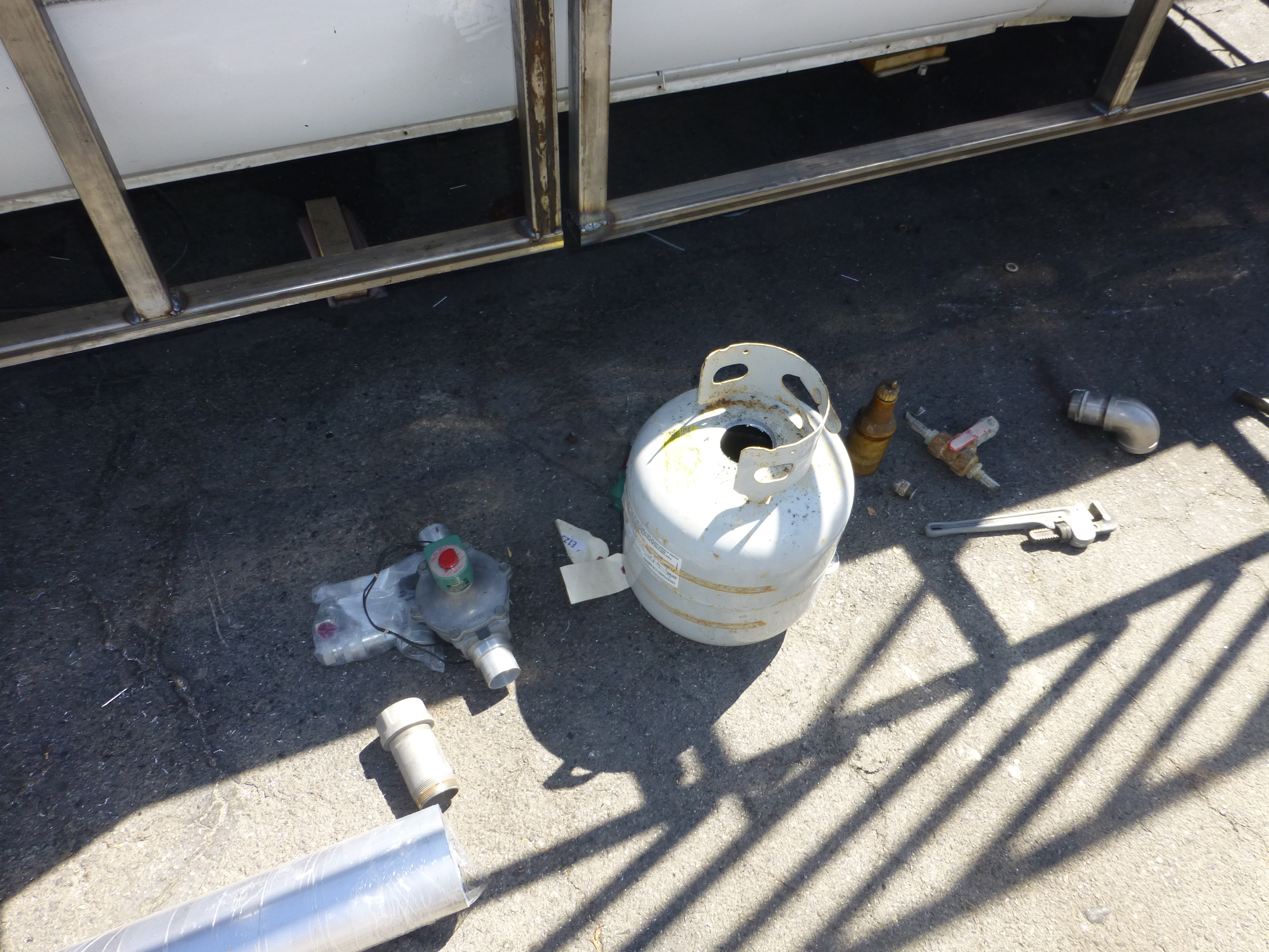 The propane tank screws directly to a cast-iron flange that exits into a 2” steel pipe.