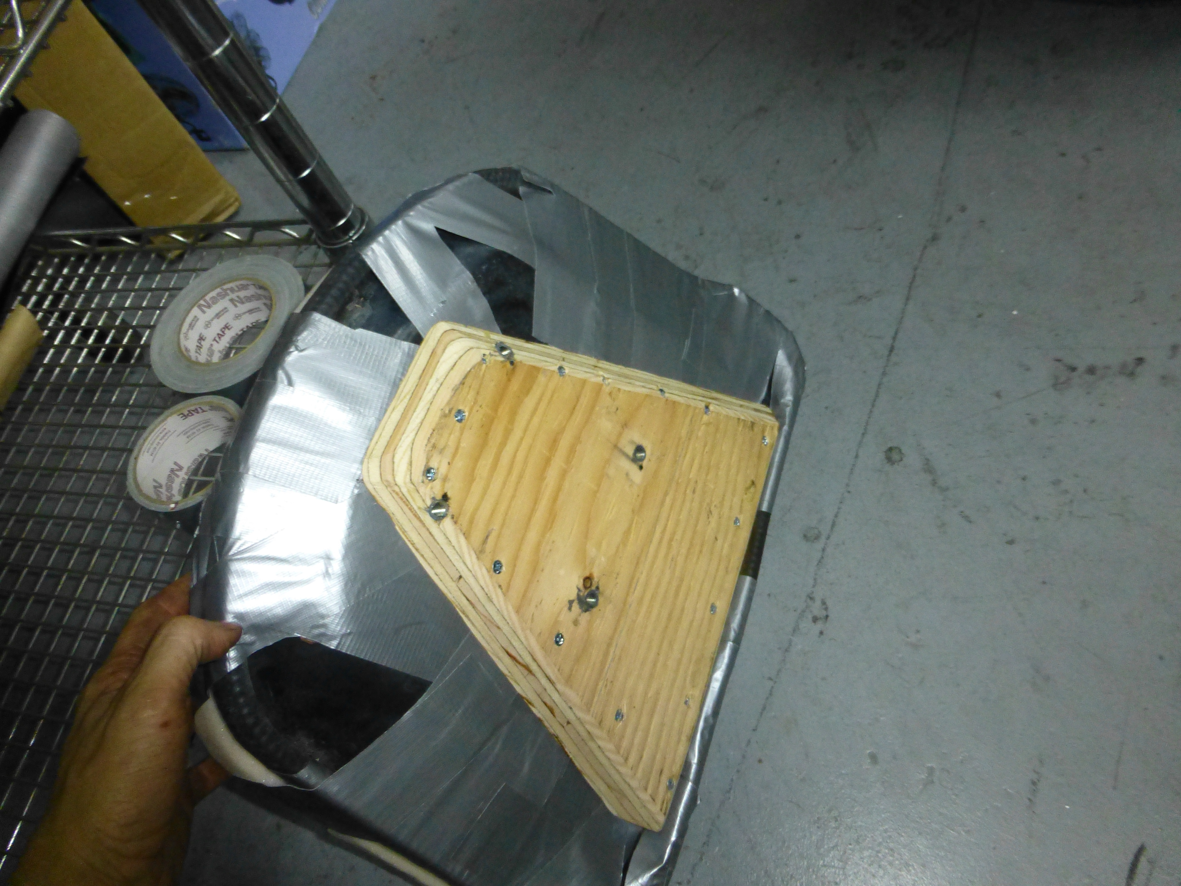 Okay, almost done. Now I just need to figure out how to make this float in place. It needs to freely move up and down and has it pivot when it encounters terrain. After giving up on the idea of having a bunch of people hold it there and call it performance art, it looks like somehow it will have to be mounted to the axle.