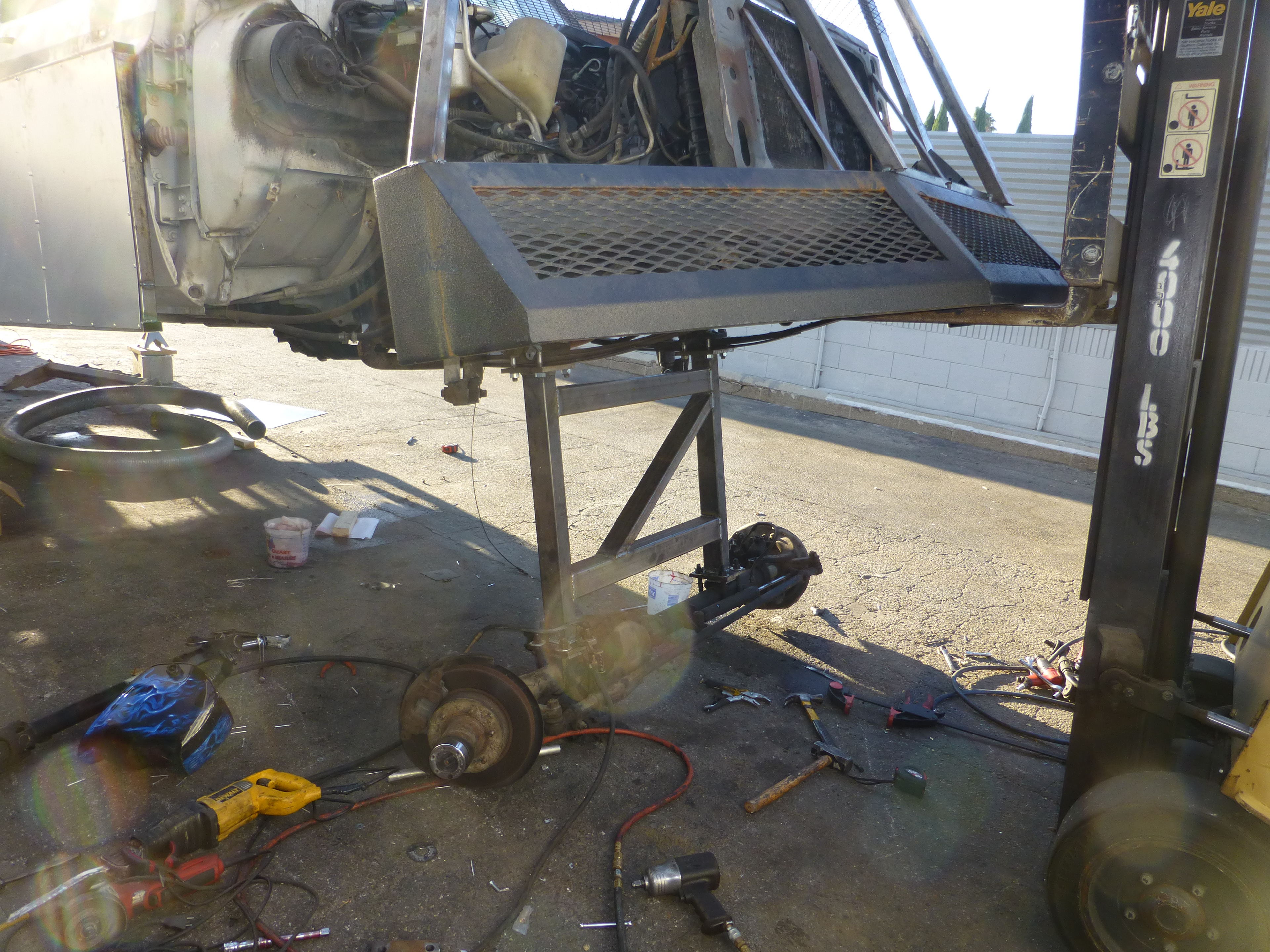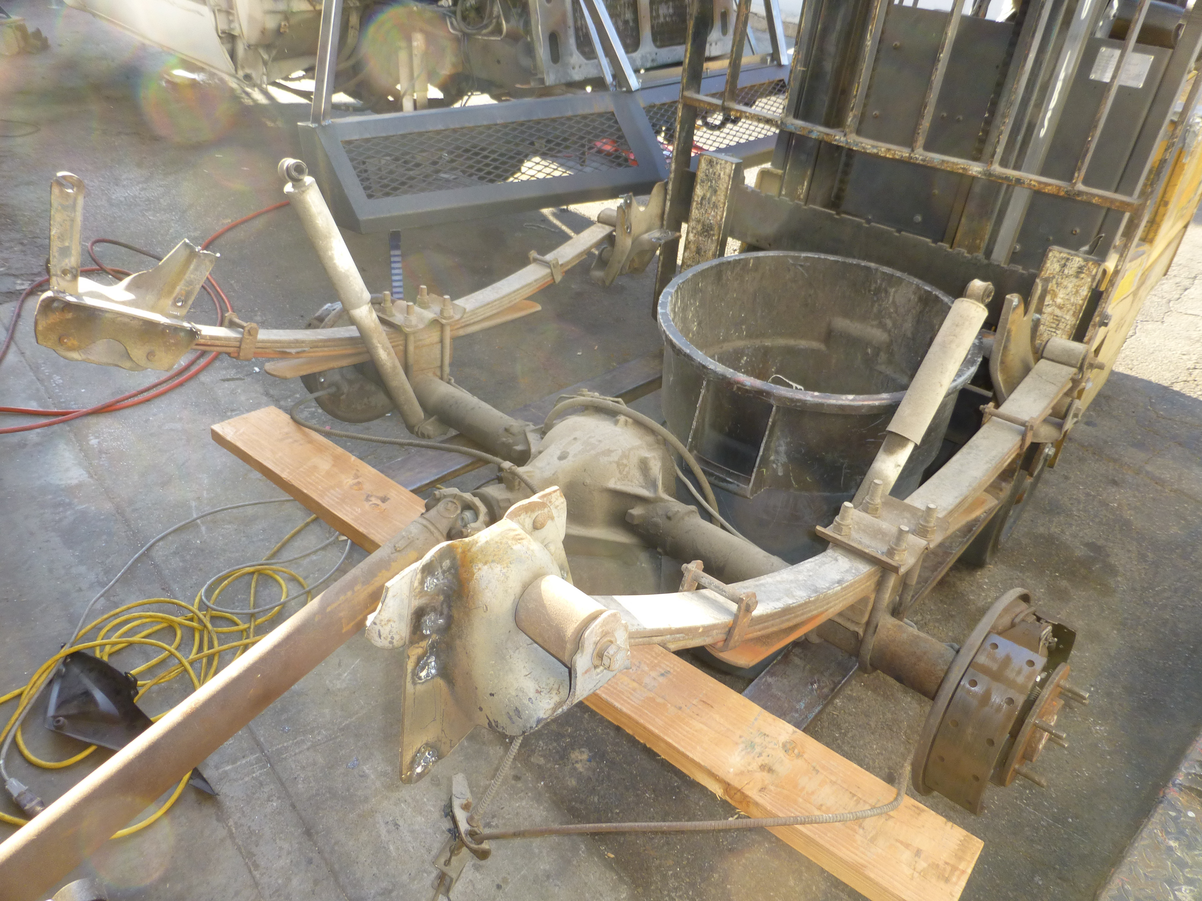 So fast-forward a little bit. I must’ve forgotten to take a few photos but I think you get the general concept. The rear end needed to move down 32 inches and back about 2 feet. I determine the easiest way was to just drop the suspension and build a frame to support in its new position. The drive shaft would end up at a pretty steep angle, but it wasn’t going to bind and were only going 10 mph. What could possibly go wrong?