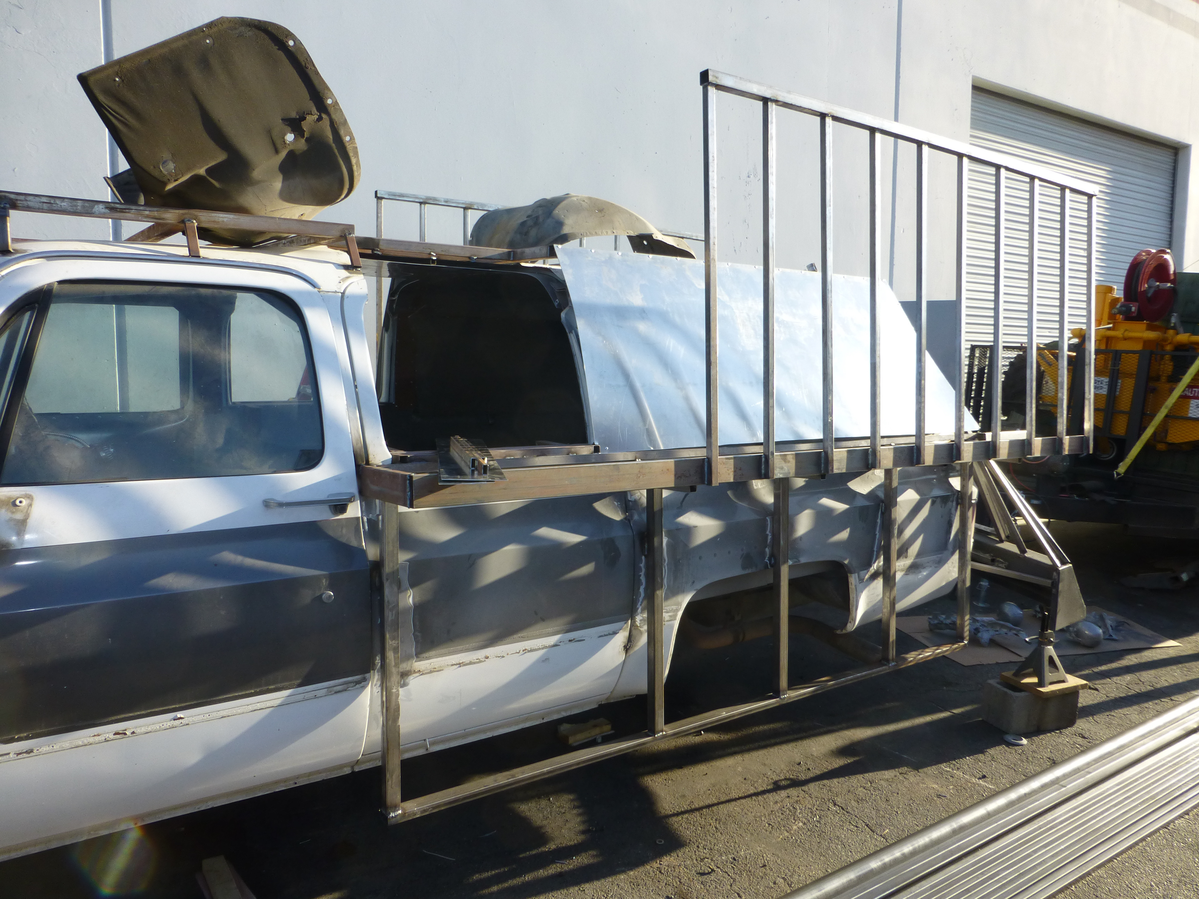 So if you’re still following along from before, the rear axle had to move back a couple feet. So here I’m extending the frame to enlarge the body. Yes, I’m jumping around a bit, so if you’re missing the professional suspension fabrication just scroll back up for your fix. If you have ADD, everything looks amazing.