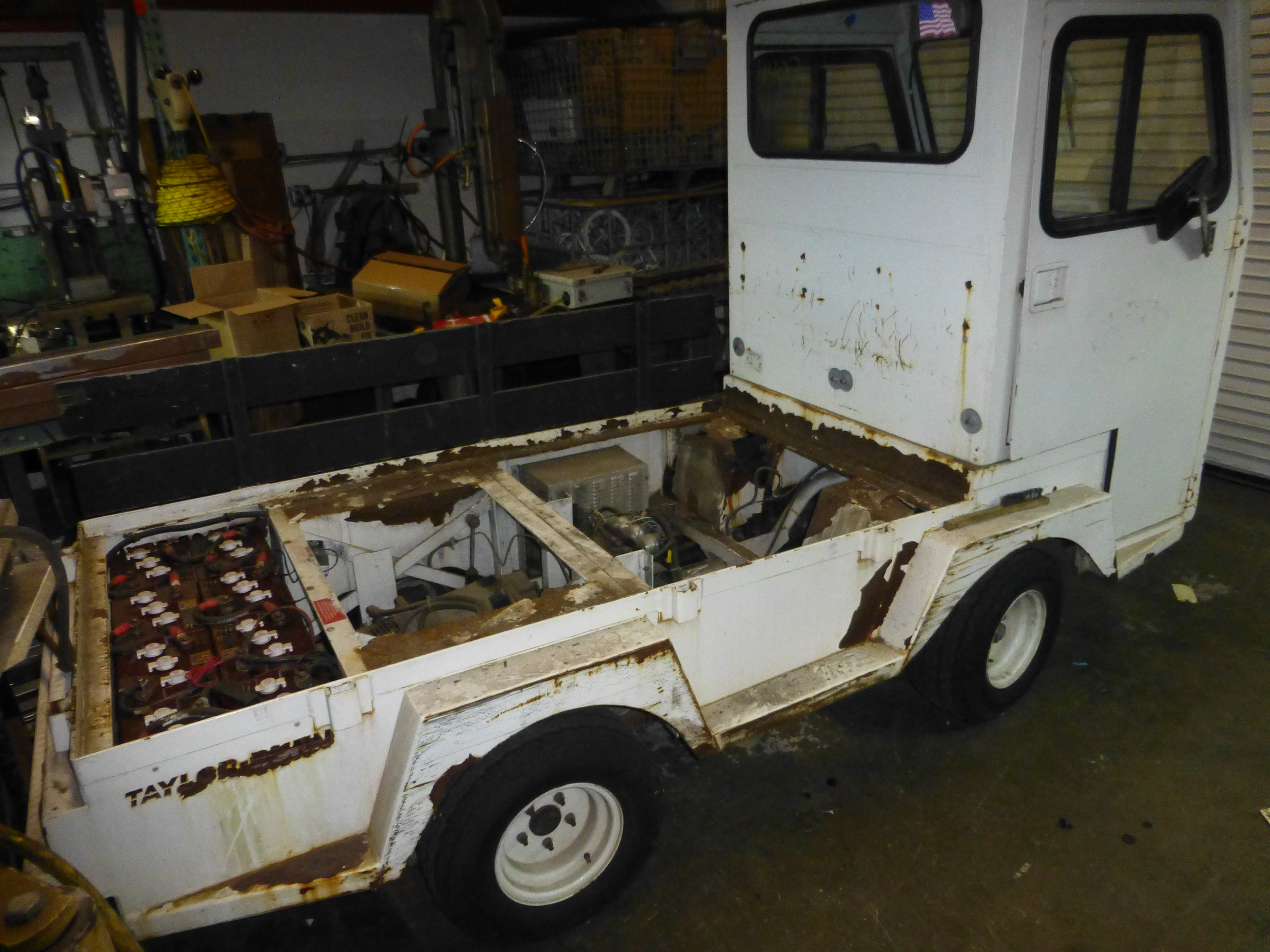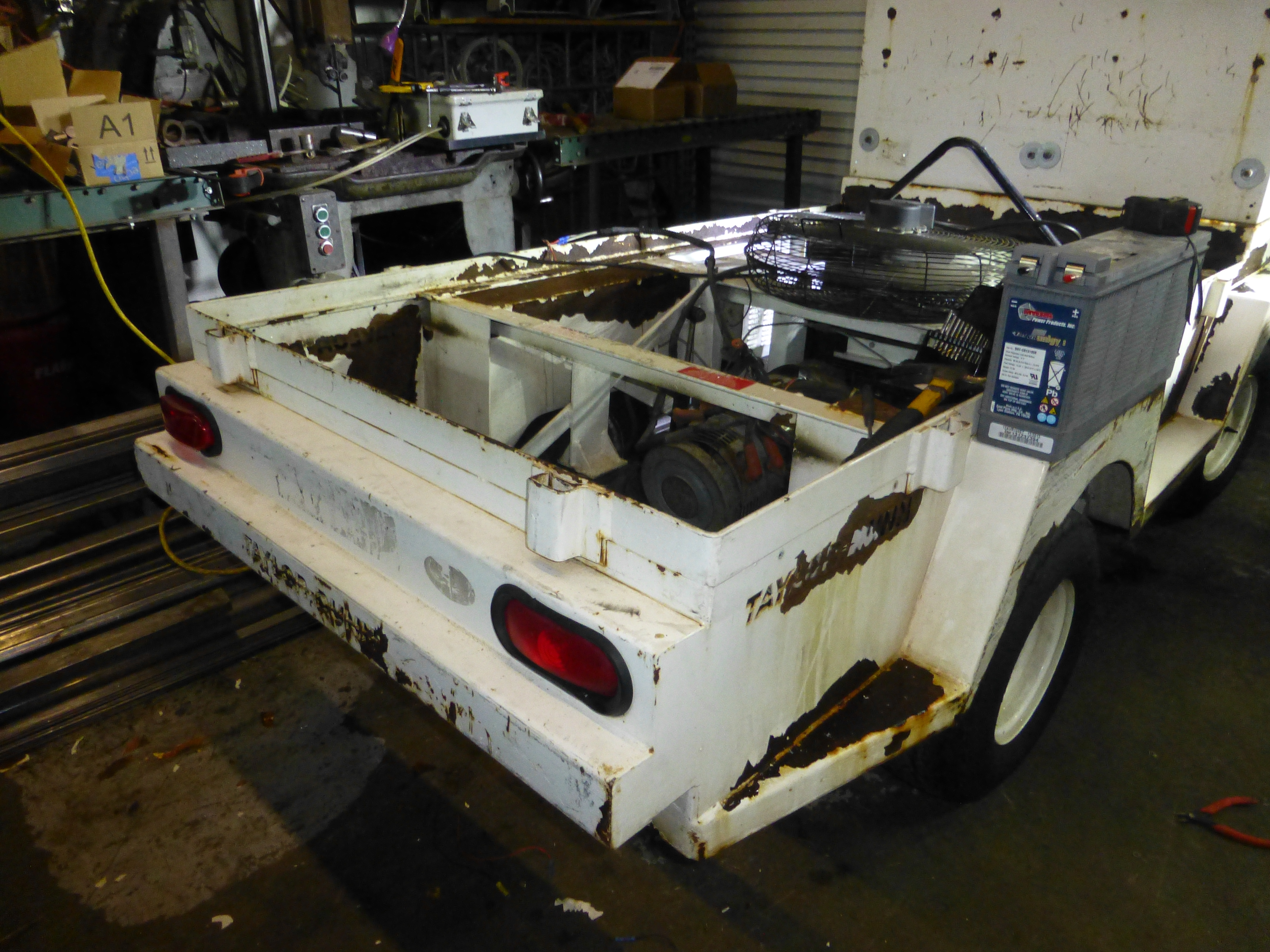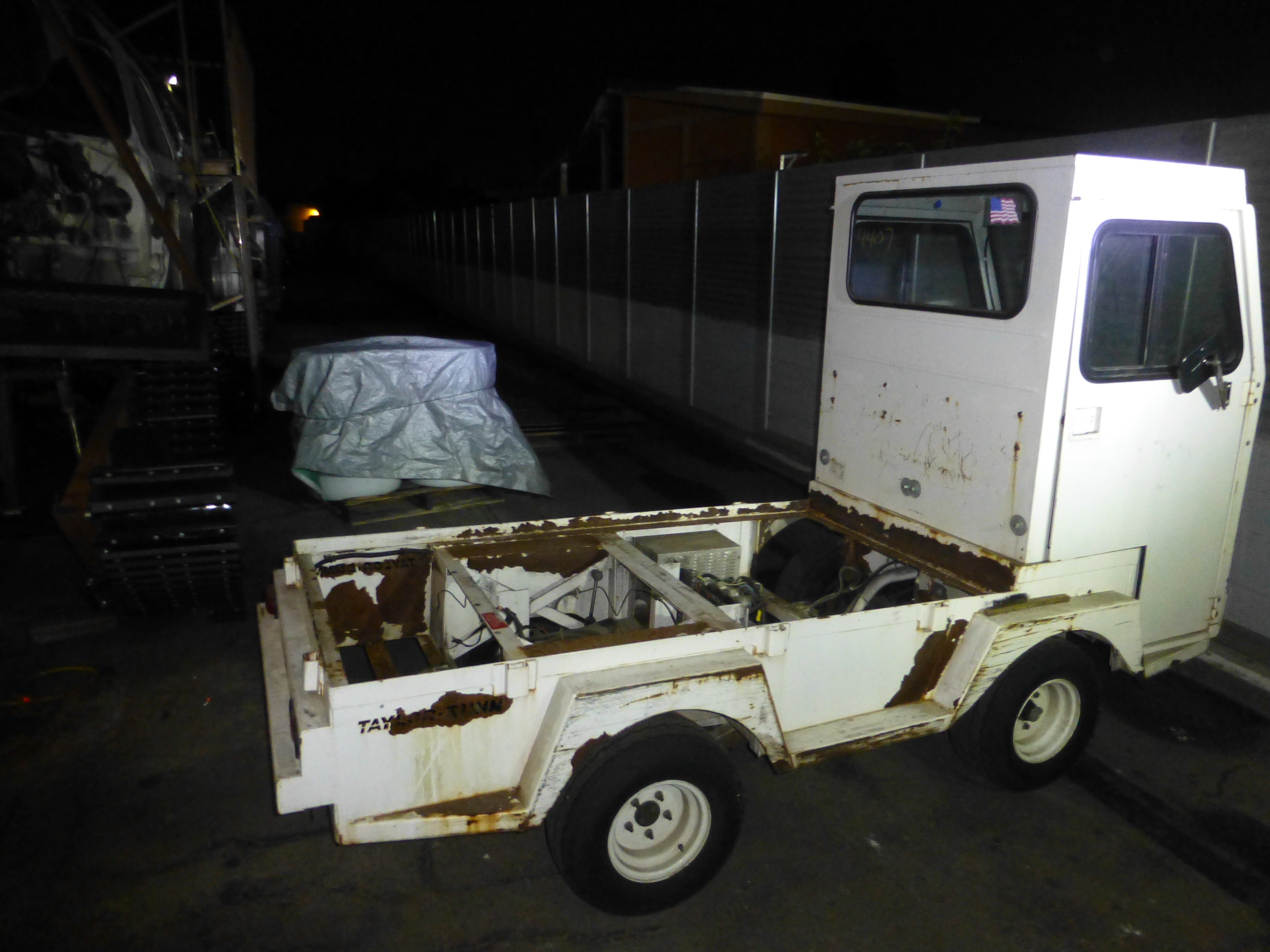 I managed to find a 48V Taylor-Dunn utility cart at auction. Like a high school romance, it had been ignored and disposed of when something shiny and new came along. However, I saw the potential in its sturdy frame that lie hidden under a patina of rust and dirt. The water had shown no mercy to the steel frame and the paint that was used by the factory was about as useful at protecting the metal as tit on a bull.